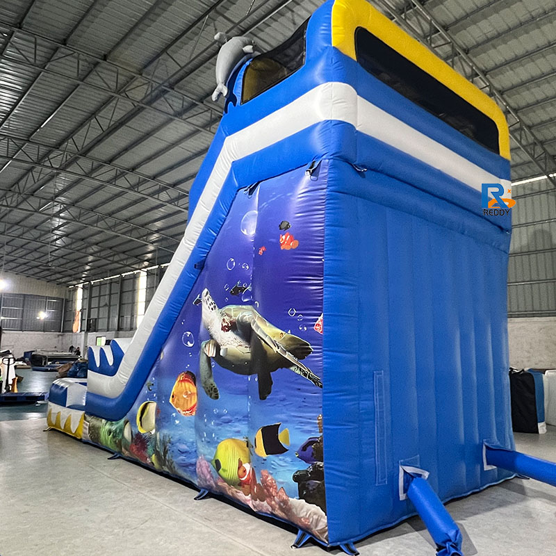 two sleek slides (perfect for friendly races!), plus a cool pool to splash down into—all decked out with tropical sea life decor (turtles, fish, coral!). Durable, quick to inflate, and safety-approved—ideal for beating the heat at parties or backyard hangouts.Turn your space into an underwater play paradise!
