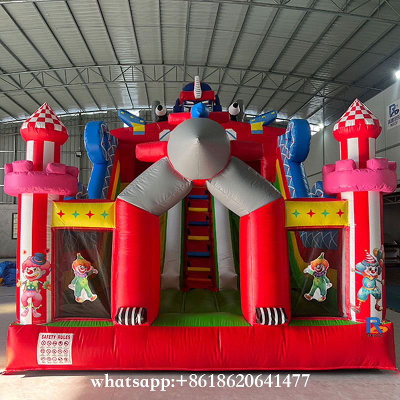 This bounce house isn’t just play—it’s a Transformer takeover! The giant robot design (plus fun clown accents) turns every jump/slide into a “save the day” mission that kids will go crazy for.
